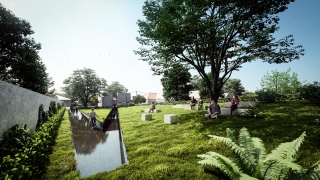Celý pozemok pretína diagonálna trhlina v rôznych výškach, ktorá rozdeľuje hmotu pamätníka na dve časti. Je symbolom silnej reakcie na udalosti, ktoré sa udiali v spoločnosti. Je bremenom a brázdou, ktorú chceme zaceliť, ale nevieme ako. Hmota pamätníka je zapustená pod úrovňou povrchu, čo je rovnako umocnením tiaže.